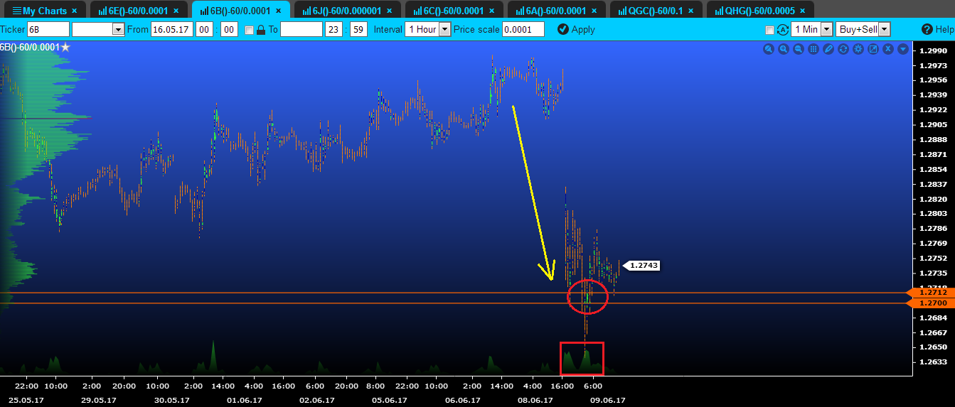 На фоне парламентских выборов фунт открылся огромным гепом и сейчас цена находится ниже предыдущего уровня поддержки. Стоит отметить новый уровень поддержки 1.2698 – 1.2710, в котором сосредоточен крупный объем.