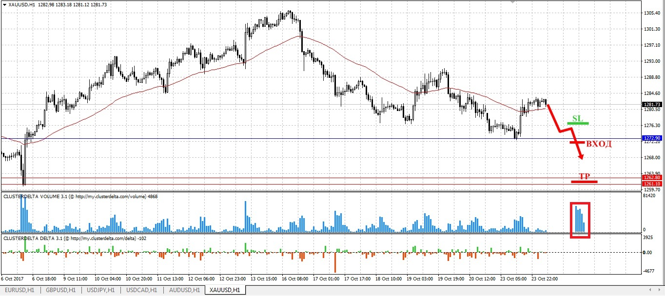 Тем не менее, учитывая нисходящий тренд по золоту и то, что рост цены был все же не на крупном, а на повышенном объеме, стоит рассмотреть сценарий падения и пробоя уровня поддержки. Движение должно быть резким и на крупном объеме, что будет более точным сигналом для входа в рынок. Стоп лосс стоит ставить чуть выше объемного пробойного бара. Первая цель сделки — 120 пунктов, вторая – 220 пунктов.
