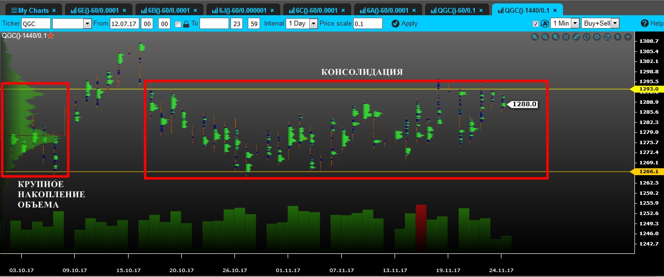 Золото все ещё торгуется в глобальной консолидации, тем не менее, сейчас цена находится в небольшой локальной консолидации возле уровня сопротивления 1292.50, поэтому стоит рассмотреть сценарий пробоя данной отметки. Это будет отличным сигналом для открытия длинных позиций, тем более, что в данном диапазоне сосредоточен крупный объем.
