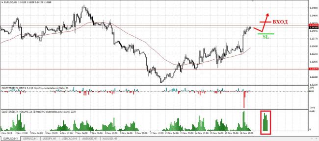 Пробойное движение должно быть стремительным и поддержано крупным объемом, что будет более точным и надежным сигналом для входа в рынок. Стоп лосс стоит ставить под пробойным объемным баром. Наша первая цель – 70 пунктов, вторая – 120 пунктов.