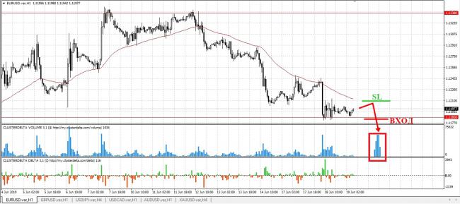 Евро продемонстрировало значительное и резкое падение на крупном объеме и пробило предыдущий уровень поддержки, что является сильным медвежьим сигналом. Тем не менее, дальнейшее снижение цены было остановлено после образования нового объемного уровня 1.1185. В данный момент цена тестирует данную отметку. Таким образом, мы можем открывать продажи только после стремительного пробоя нового уровня.