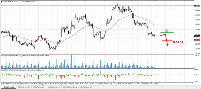 Евро продолжило свое резкое падение и в данный момент торгуется вблизи уровня поддержки/нижней границы локального диапазона 1.1185. Учитывая, что движение было на крупном объеме, мы можем рассмотреть сценарий пробоя данной отметки, что позволит открывать короткие позиции.