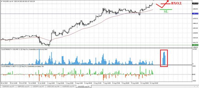 Покупки можно открывать после продолжения данного роста, но движение должно быть поддержано крупным объемом, что будет более точным и надежным сигналом для входа в рынок. Стоп лосс стоит ставить чуть ниже начала этого движения. Потенциал сделки составляет более 200 пунктов.