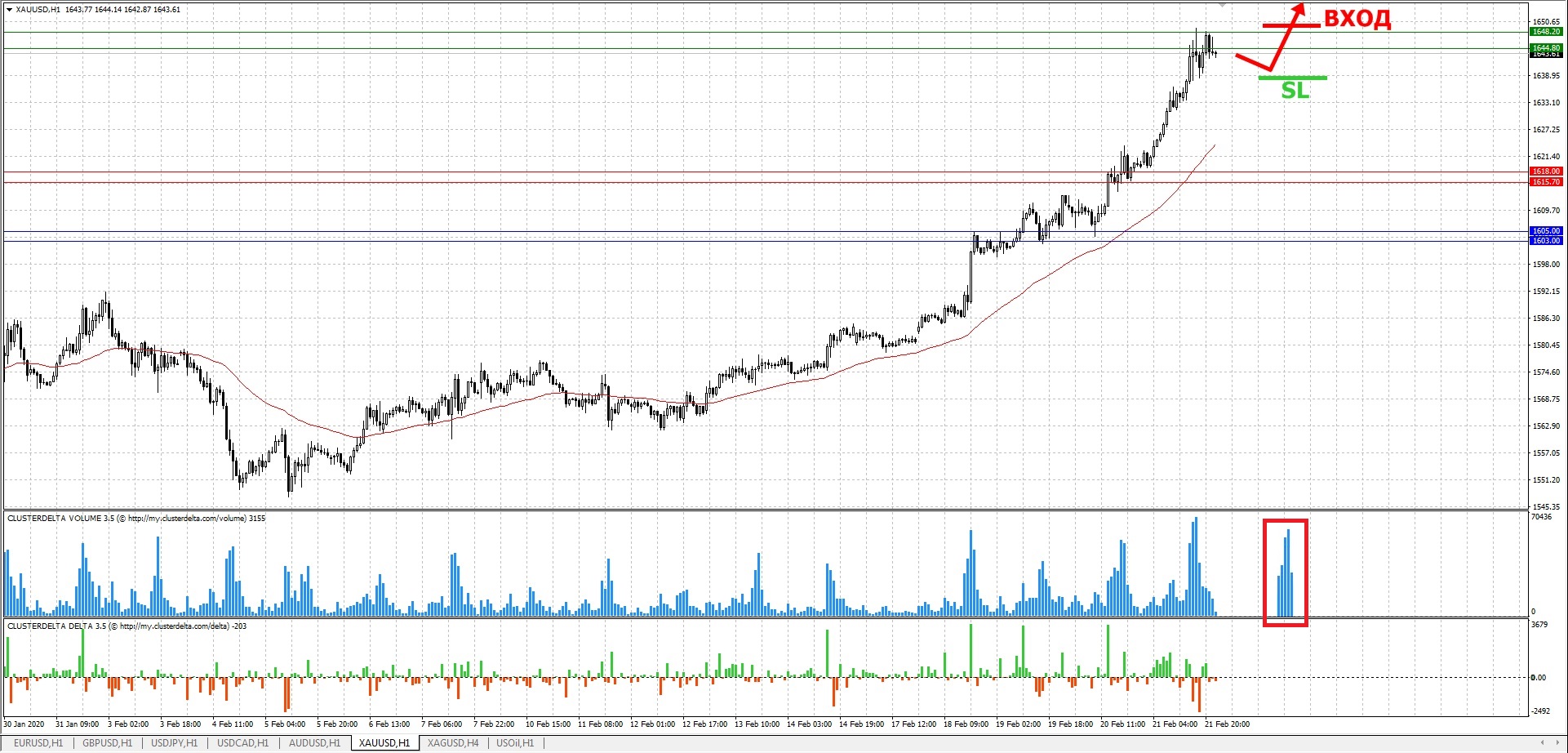 Пробойное движение должно быть резким, уверенным и поддержано крупным объемом, что будет более точным и надежным сигналом для входа в рынок. Стоп лосс стоит ставить чуть ниже пробойного объемного бара. Потенциал сделки составляет более 300 пунктов.