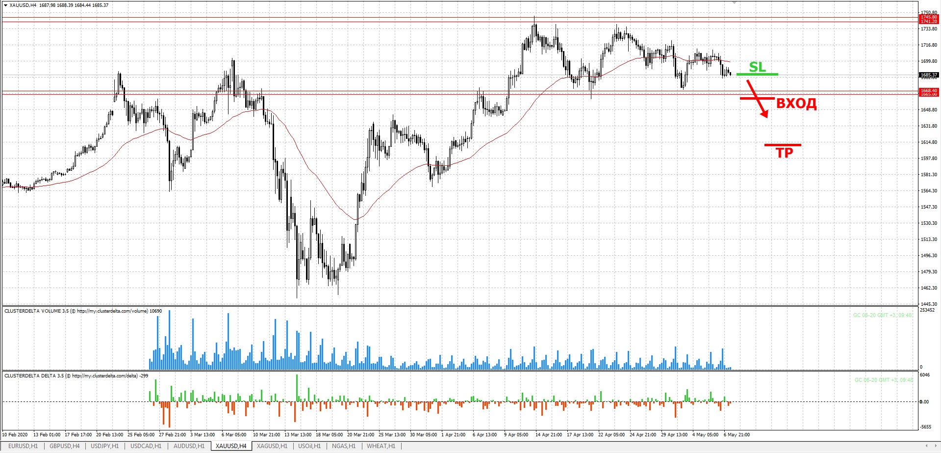 Золото продемонстрировало значительное падение на огромном объеме, что указывает на значительный дисбаланс продаж в моменте. Сейчас цена торгуется вблизи уровня поддержки/локального минимума 1665.00 – 1668.40. Таким образом, мы можем рассмотреть сценарий пробоя данной отметки. Это позволит открывать короткие позиции по данному инструменту.