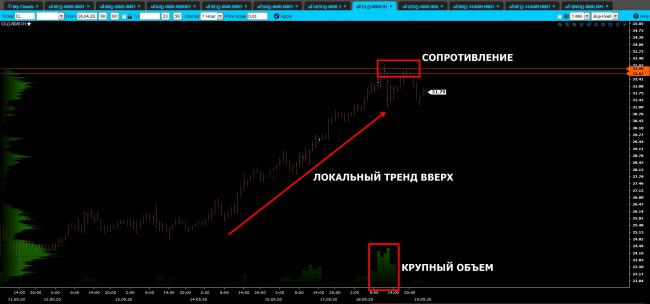 Необходимо выделить новый объемный уровень сопротивления 32.90 по нефти марки WTI. Цена протестировала его, но не смогла пробить и сейчас цена торгуется вблизи данной отметки. Учитывая этот факт, а также наличие сильного локального восходящего тренда, мы можем рассмотреть сценарий пробоя данного уровня. Это будет отличным сигналом продолжения роста, что позволит нам открывать длинные позиции.