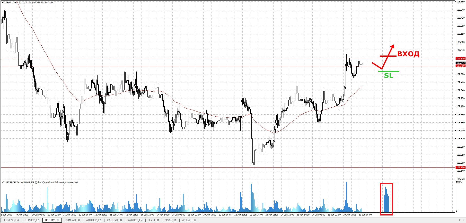 Пробойное движение должно быть резким, уверенным и поддержано крупным объемом, что будет более точным сигналом для входа в рынок. Стоп лосс стоит ставить чуть ниже пробойного объемного бара. Потенциал сделки составляет более 80 пунктов.
