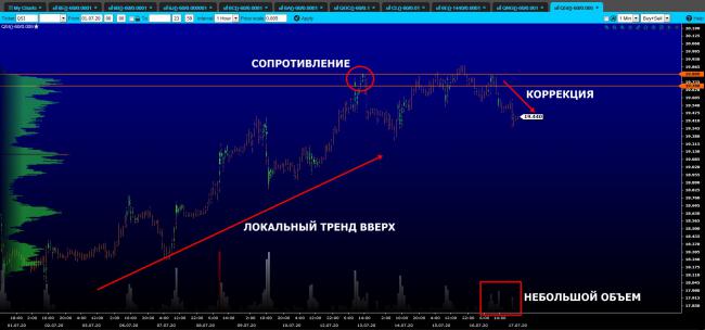 Серебро протестировало уровень сопротивления 19.28 – 19.35, после чего цена скорректировалась вниз. Падение было хоть и резким, но на небольшом объеме. Более того, цена продолжает находится вблизи данной отметки. Таким образом, продавцы пока не могут развернуть локальный восходящий тренд по серебру.