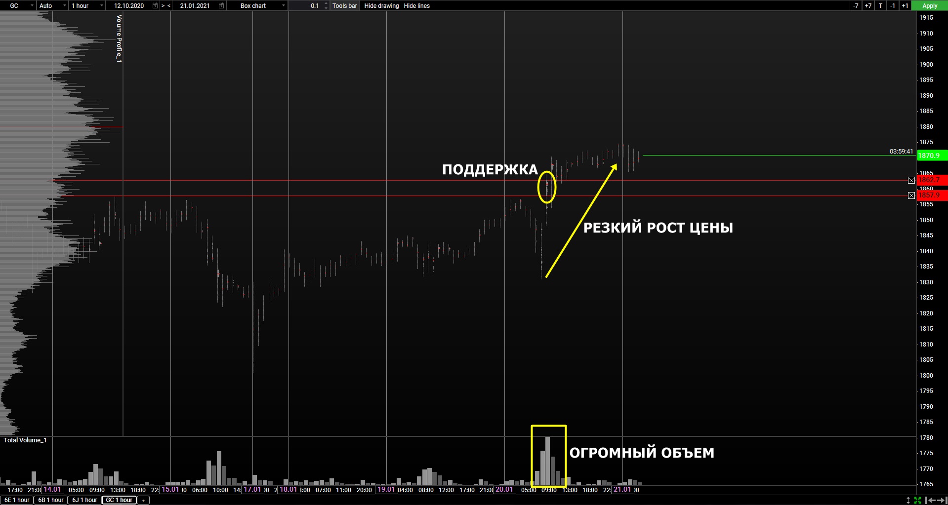 Золото продемонстрировало значительный и резкий рост на огромном объеме, что указывает на большой дисбаланс покупок в данный момент (покупки>продажи). Как следствие, цены пробила предыдущий уровень сопротивления, что открывает дорогу для дальнейшего роста. Также необходимо выделить новый объемный уровень поддержки 1858.20 – 1862.80.