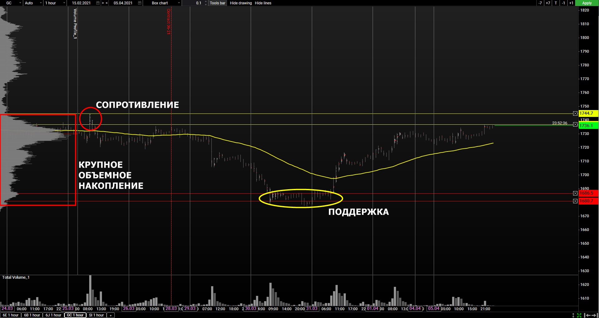 Золото продолжило свой рост и сейчас пара тестирует уровень сопротивления/верхнюю границу локального диапазона 1737.00 – 1745.00. Восходящее движение было стремительным и поддержано крупным объемом, что указывает на интерес крупных игроков. Учитывая, что крупный объем сконцентрирован внутри консолидации, выход цены из данного диапазона будет отличным сигналом для входа в рынок.