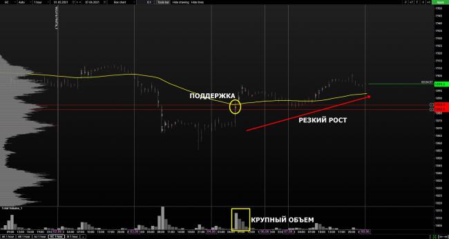 Золото продолжило свой рост после значительного и резкого скачка в конце прошлой неделе. Восходящее движение было поддержано крупным объемом, что показывает заинтересованность крупных игроков во время этого роста. Кроме этого необходимо выделить новый объемный уровень поддержки 1880.30 – 1883.30. Учитывая эти факторы, а также поглощение предыдущего падения, что указывает на слабость продавцов, нам стоит отдавать предпочтение длинным позициям.